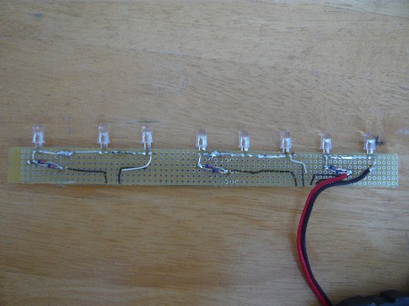 温度パネルの回路は青・黄・赤のLEDを直列で繋ぎ、CRD(15mA)を並列2個で繋げて30mAを流します。 回路が完成したら拡散キャップを被せておきます。 |