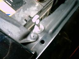 これは、ボンピンの取り付け部分の画像です。FRPボンネットに交換すると、軽さのために走行風で浮き上がってしまい大変危険です。これを防ぐ為にボンピンの取付は必須になります。おいらは近くのカーショップで買ってきた汎用のボンピンを使用しました。 上の画像の場所には、元々、ボンネットを支える為のゴムが付いたボルトがあるんですが、これを取り除いてしまいます。 そして、ボンピンのボルト径に合わせてドリルで穴を大きくします。固定するには上下からナットで締めこみます。下側のナットは、フェンダーライナーを外せば簡単に付けることが出来ます。 |