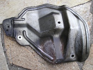 ブレーキマスター周りの純正遮熱板を取り外したところ。 ボルト3本で留まっています。 見ての通りサビサビなので、粗めのペーパーできれいさっぱり落とします。 |