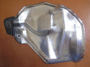 遮熱板に貼り付けたところ! 意外に簡単にキレイに貼り付けられます。 ネジ穴が中に溜まった空気を抜いてくれるからでしょうね。 ネジ穴はドライバーでグリグリやって空けてあげればOK。 あと、余った切れ端で遮熱板の左端も貼り付けるとちょうどピッタリです。 |