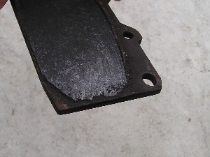 一番薄くなっているパッドの拡大画像! パッドの厚みは0.2mmくらいしかありません(笑)。ブレーキパッドの残りが少ないのを知っていながら、どこまで耐えられるか試したものですので、良い子の皆さんは真似しないでください(爆)。 |