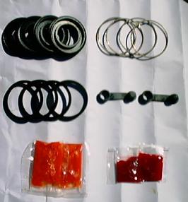 取り外したピストンシール。 これはブレーキフルードがピストンの横からはみ出さないようにするものです。←合ってるかな?!(^_^;) あと、これには上下の違いがあるようです。取り外す時にどちら側が上についていたか確認しておいてください。あ、もちろん取り外したピストンシールは再利用不可ですよ〜。 全部ばらし終わったら内部をブレーキクリーナーで洗浄します。古いグリスが残っているとあまり良くありませんよね。 |