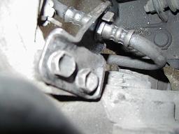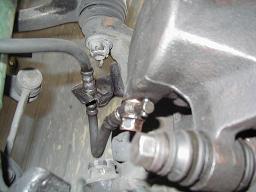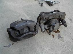 ブレーキラインのブラケットを外したら、17ミリのボルト2本でキャリパー本体が固定されているので緩めます。そうするとキャリパーがハブキャリアから外れますので、14ミリのボルトを緩めてブレーキラインを外します。 フロントはリヤと違って、ラインがねじれないので普通に緩めれば外せます。 |