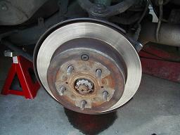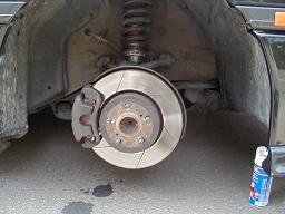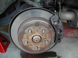 では作業ですが、今回はリヤからやります。 ジャッキアップをし、確実にウマを掛けたらキャリパーをブラケットごと外します。14ミリのボルト2本で止まってます。 ブレーキラインは17ミリのスパナで緩めますが、リヤハブキャリアからブレーキキャリパーを外す前に、ブレーキラインをある程度緩めて、その後キャリパーを外すとすんなりと外せます。 |