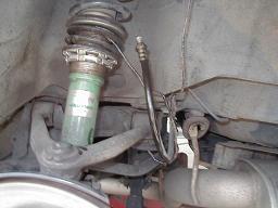 | キャリパーからブレーキラインを外すと、ブレーキフルードがドバドバ出てきます。これを防ぐために、針金ハンガーを使ってブレーキラインの口を上向きにして吊り下げておくことで対処しました。 |