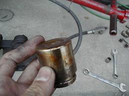 更にキャリパーをバラすとこんな感じになります。 左からキャリパーブラケット・シリンダー・ピストンです。 オーバーホールする時はこのシリンダーに対して、シリンダーブーツなどのゴム部品をキットに入っている部品と交換していきます。 |