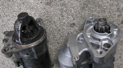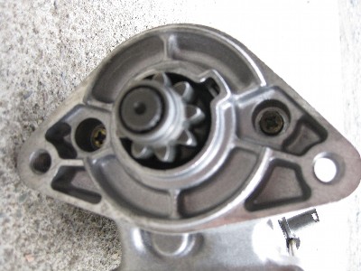 セルモーターのギヤ部分のドアップ。 このギヤでフライホイールの外周を回します。 キーをひねると、このギヤの部分が出っ張ってきてフライホイールに接触します。 |