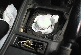 まず、シフトレバーをはずします。 ミッションをはずす時にオイルが吹き出すかもしれないので、 ビニール袋などできっちりと留めておいた方がいいです。 |