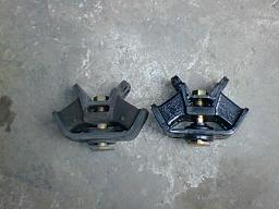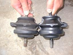 左が取り外したエンジンマウントで、右が新品です。 千切れてはいませんでしたが大分潰れています。 |