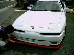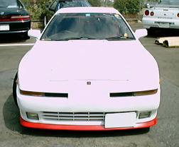斜め前から見た所! くぅ〜、かっこいいじゃないですか〜。 ホワイトのボディに赤いリップスポイラーってに合うと思いませんか? 車高も落ちているので、更に決まって見えますね〜。 |