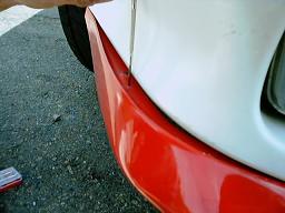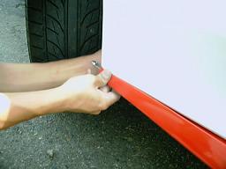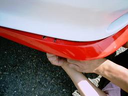 リップスポイラーのこの部分にはボルト穴がありません。フロントバンパー側にはちょうど良い具合に穴があったので、それに合わせるように穴をあけることにしました。 しかし、穴をあけるキリが無かったので、小さいドライバーで少しずつ穴を開けていく作戦をとりました(笑)。 |