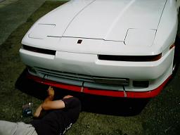 まず、リップスポイラーの位置合わせを行います。 ここで問題発覚!リップスポイラーはワイドボディ用なのでたいらあさんのスープラよりも横幅が広いことが分かりました。 だけど、ちょっと引っ張れば何とかなりそうだったので、とりあえず取り付けてみることにしました。 しかも、色はレッドのまま。これも合わせてみたら意外とかっこよかったので、このまま取り付けます。(^^) |