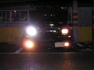 運転席側だけHIDを取り付けた状態でヘッドライトをONにしてみました。 明るさが全然違いますね〜〜!白さ、光量ともにハロゲンを上回っているといえます。 |