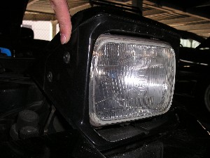 左側の画像がサムライさん号に着いていた社外ハロゲンです。運転席側のバルブがしっかり切れていることが確認できると思います(笑)。 HID装着にはヘッドライトユニットを取り外します。右側の画像で指差しているネジを左右2本ずつ外すと、ライトユニットを固定しているネジが見えますのでこれを外せばOKです。最後に、内側のバルブ用コネクタがあるので気をつけて引き抜きます。 |