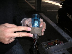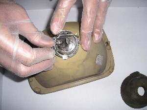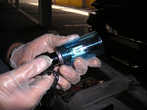 ヘッドライトユニットの裏側。 ゴムのカバーを取り外すとバルブを留めているクリップがあるので、これを横にずらすように外せばいとも簡単にバルブを取り出すことができます。これでハロゲンバルブとはおさらばです(笑)。 手袋をしているのは、誤ってバルブの表面を触ってしまわないようにするためです。サムライさんが事前に準備してきていました。用意周到ですね〜。 あと、ガラス面を下側にして作業するので、傷つけないようにHIDが入っていた箱をひっくり返してその中で作業しました。 |