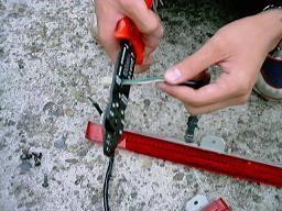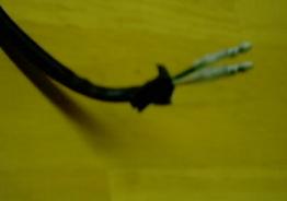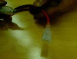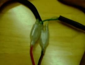 さて、加工作業に入ります。 まず、配線の先についているカプラーを切り取ります。2個のうち一つは再利用するのであまり短く切り過ぎないように注意します。 ちなみに緑色がプラス配線、白黒がマイナス配線になります。 |