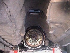 (8)いよいよ降ろしますが、ここは2人で作業を行います。一人はMTの真下に潜り、手で支えながら更に隙間を広げていき、もう一人は先程MTにかましたジャッキの高さを下げていきながらジャッキを後退させます。MT下に潜った人がMTの状態を確認しながら指示を出しゆっくりと降ろしていきます。ジャッキを後退させる際にフロアトンネルに引っかかりジャッキがMTの重心からずれて落ちたりすると危険ですので、手でベルハウジングの部分をしっかり支え、また重心にしっかりと乗っているかを確認しながら降ろします。これで降ろす作業は終了です。(→画像3)