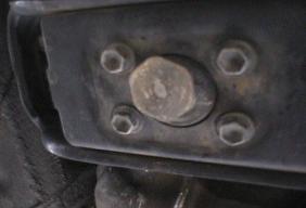ジャッキでクルマを持ち上げて、ミッションマウントを外します。 場所はこのボルトが4本留まっている部分の真上です。 画像は斜めから撮影していますが、真ん中の丸い部分が大分後ろ側にずれているのが分かると思います。 これほどずれていると、ほぼヤバイ状態と思っていいでしょう(爆)。 |
