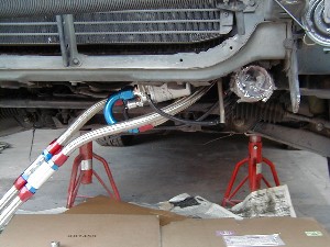 サーモブロックとコアを配管します。 出来た!と思ったらここでまたもや大失敗!詳細はこちら。 原因はコア側の六角部分にレンチを掛けないで締め付けていったため、締め過ぎてしまい、オイルクーラーコアの口を折ってしまいました。そのため急遽同じコアを買う事に。。。これは勉強不足でした。 |