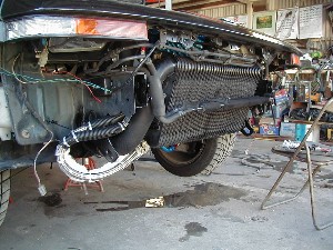 オイルクーラーコアを指定の位置に取り付けます。 これも取付説明書に従って・・・・と言いたい所ですが、取付説明書をちらっと見ただけでやろうとすると訳が分からなくなるので、取付説明書を見つつ実際に合せながらやるのがポイントです。 |