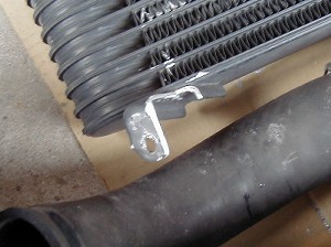 更に加工作業が続きます。トラストのインタークーラーを装着しているクルマであれば加工の必要は無いのですが、私の70は純正インタークーラーなので、加工が必要となりました。 これも取付説明書を参考に加工します。加工箇所は、純正インタークーラーの運転席側のステーの一部分です。 ホーンステーに比べて、この部分は軟らかいのでサンダーでさくっと削れますが、インタークーラーのコアに傷をつけないように注意して加工する必要があります。これも念の為、加工部分をシャーシブラックで塗装しておきました。 |