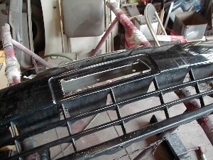 | 続いて、ターボAダクトを装着するためのバンパー加工ですが、バンパーは現物合せでカットし、ターボAダクトを装着した状態で塗装します。 |