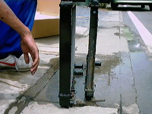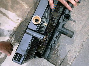 | 無事に外れた(?)純正ラジエターです。外側はマメに洗い流してたつもりですが随分汚れてました。 |