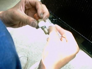 | 外した水温センサーを移植する前に、シールテープを巻いて水漏れを防止します。 |