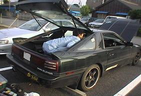 サカイさんの取り付け作業風景(笑)。 トランクの中身は全部取り出しておいた方がいいですね。 内装をきった時の切りくずが結構飛び散ります。 |