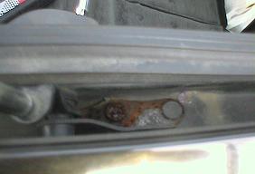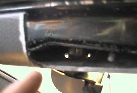 リアハッチのダンパーの根元を真上から見たところです。 2本のボルトが見えますが、これを共締めして固定します。 |