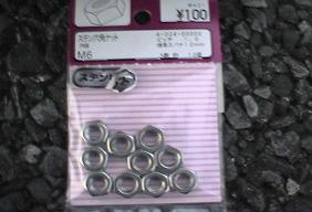 取付に使うナットは近くのお店で買ってきました。 ツバ無しのM6ナットです。 ちょっと見栄を張ってステンレス製にしました(笑)。 雨水が通るのでステンの方がいいかもしれないですよ。 値段も100円くらいですし。(^^) |