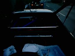 取付後、後ろから見たところです。暗くてよく分かりませんが、キラッと輝いています。(^^)。 上下位置は、トノカバーの少し上側になります。 あと、すぷらさん自作のピラーバーをつければリアの剛性は完璧になりそうですね(笑)。 |