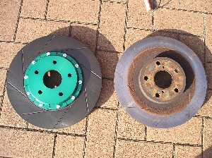 新しいローター、SCRプロとの比較。 もちろん、右側のSCRだって新品の時はきれいな緑色が映えていましたよ(笑)。 |