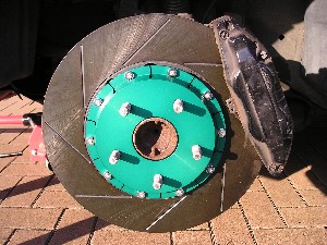 裏側。 ベルハウジングとローターを留めている部分がよく分かると思います。 この真ん中の緑色の部分をベルハウジングと言い、アルミ製とすることでこの部分の大幅な軽量化が実現できます。 |