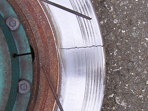見事にクラックの入ったローター。 このくらい割れるとブレーキを踏んだ瞬間に振動が足の裏に伝わります。(^_^;) |
