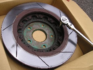 新品ボルトでローターをベルハウジングに固定します。 ボルトは1.2Kのトルクで締め込めって指示があったのでトルクレンチを使うことになります。 (トルクレンチはすぷらさんにお借りしました。すぷらさんサンクス!) ここでさっきの六角コマが役に立ちます。 1.2Kのトルクの感覚は、ドライバーでネジを最後まで締めこんだ位の力加減ですね〜。大体把握しました。 次からはトルクレンチは必要ないかも?!(笑) 当然制動装置なので自信の無い方はプロにお願いしてください。 |