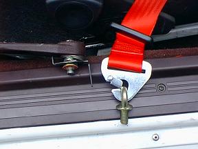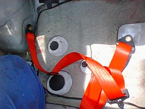 | ベルトのフックをアイボルトにかけて、背もたれの位置から後ろにベルトを通して前側は終了です。 |