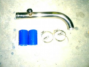 これがステンアッパーホースのキット内容です。 シリコンホースとホースバンドは別売りとなっていますので注意してください。 |