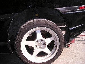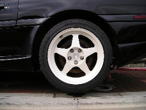 ジャッキを降ろしたところ、、、ではなくて、TEIN・HAを組み込んだところです(笑)。タイヤが地面からちゃんと離れているところに注目してください。 これだけショートストローク化されていると、通常街乗りで段差を乗り越えるときに気を使う必要がありそうです(笑)。うちのスープラには機械式LSDが組まれているので少しは大丈夫だとは思いますが。。。(^_^;) だけど、このショートストロークがサーキットでは効いてくるんです!走行会仕様で割り切れるのであればオススメします。 |