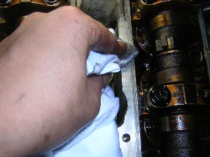 エンジン本体のオイル汚れやシールパッキンを落とす所です。古いシールパッキンはなるべく手で取ったほうがいいんですが、最悪はキズをつけないように注意しながらマイナスドライバーで取ります。 オイルの汚れとかはパーツクリーナーを布につけて拭きます。 |