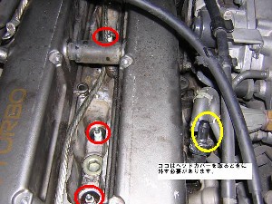 ヘッドカバーをはずす作業に入ります。4枚目で黄色にマルしたところを外します。 ブローバイのホースも外すんですが、かなり硬化しているので外すのに苦労しました。 そしてパキパキに割りました(爆) 新しいものは用意してから作業するほうが望ましいです。 万が一用意できずに割れてしまった場合はビニールテープでぐるぐる巻きにして下さい。(笑) |