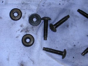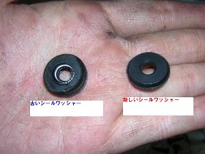 ヘッドカバーをとめていたネジとワッシャーをバラバラにした所です。 ワッシャーは新しいものと組み替えます。2枚目の画像は新しいワッシャーと古いワッシャーを比較したものです。 |