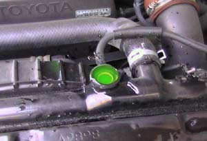 ホースを抜いた途端にクーラントのシャワーでした! おかげでおいらは頭からかぶっちゃいました(笑)。 |