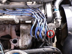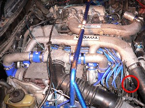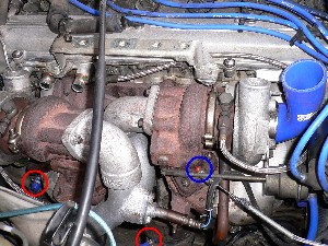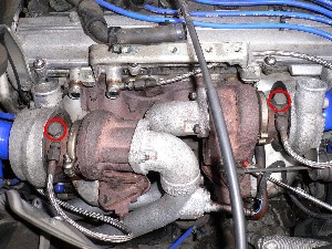 今回のタービンは水冷ではないため、ウォーターラインを塞ぎます。 まず赤丸のウォーターラインを、純正ホースを使ってリターンさせます。 |