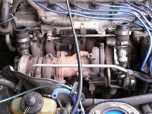 作業手順 1.LLC&OILを抜きます。 2.LLC&OILが抜ける間の時間を利用して、フロントパイプ&タービン周りの邪魔な物を外します。 3.OILライン&ウォーターラインを外します。 4.タービンを外します。 5.ゴミ、水、OIL等が混入しない様に各所にメクラをします。 6.普段手の届かない様な所を洗浄します。 7.タービン取り付け 8.OILラインを取り付けます。 9.ウォーターラインリターン&メクラキャップを取り付けます。 10.フロントパイプの取り付け&外した物を元に戻します。 11.OIL注入&LLC注入。あと、エア抜きをします。 12.OIL&LLC漏れを確認して終了です。 まずOIL&LLCを抜きます。 一見するとそんなに汚く見えないのですが後で大変な事に?! |