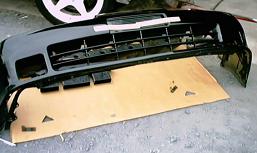 取付には当然ながらフロントバンパーを取り外します。 スープラの純正フロントバンパーはたくさんのボルトで留まっているので、取り外しが大変です。どのボルトがどこについていたか忘れないようにしてくださいね〜。絶対に何個かボルトが余ります(笑)。おいらは逆に足りなくなりました(爆)。 ちなみに、70スープラ純正フロントバンパーは上の画像のとおり、自立することが判明しました(爆)。 |