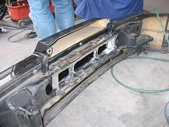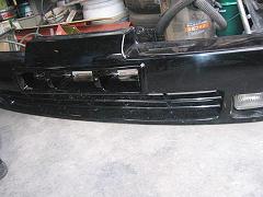 フロントバンパーの裏側です。ウレタンの衝撃吸収剤が入っていますので、それは取り外します。もちろんレインホースも取り外しますよ〜。 レインホースとウレタンもターボAダクトの形状に合わせて切断します。 レインホースはかなり固いので、サンダーや溶接機を使って切断する必要があります。 |
