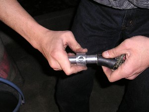 切断したヒーターホースにバイパスアダプターをねじ込みます。 これがまた結構キツイので力が要る作業になります。(^_^;) ここが一番の難所ですね(笑)。CRC等の潤滑剤を使ってねじ込みましょう。 ねじ込み後の画像を見て分かる通り、結構パンパンに膨れていますよね。(^_^;) |
